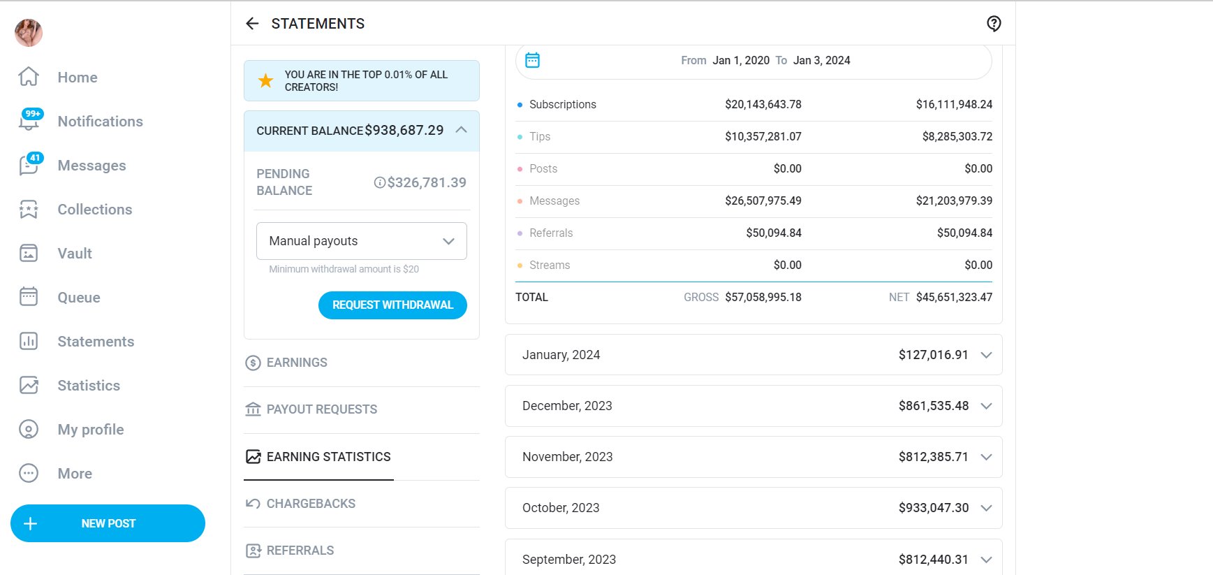 - Monthly ceiling: ~$1.5 million on OnlyFans in a strong month.