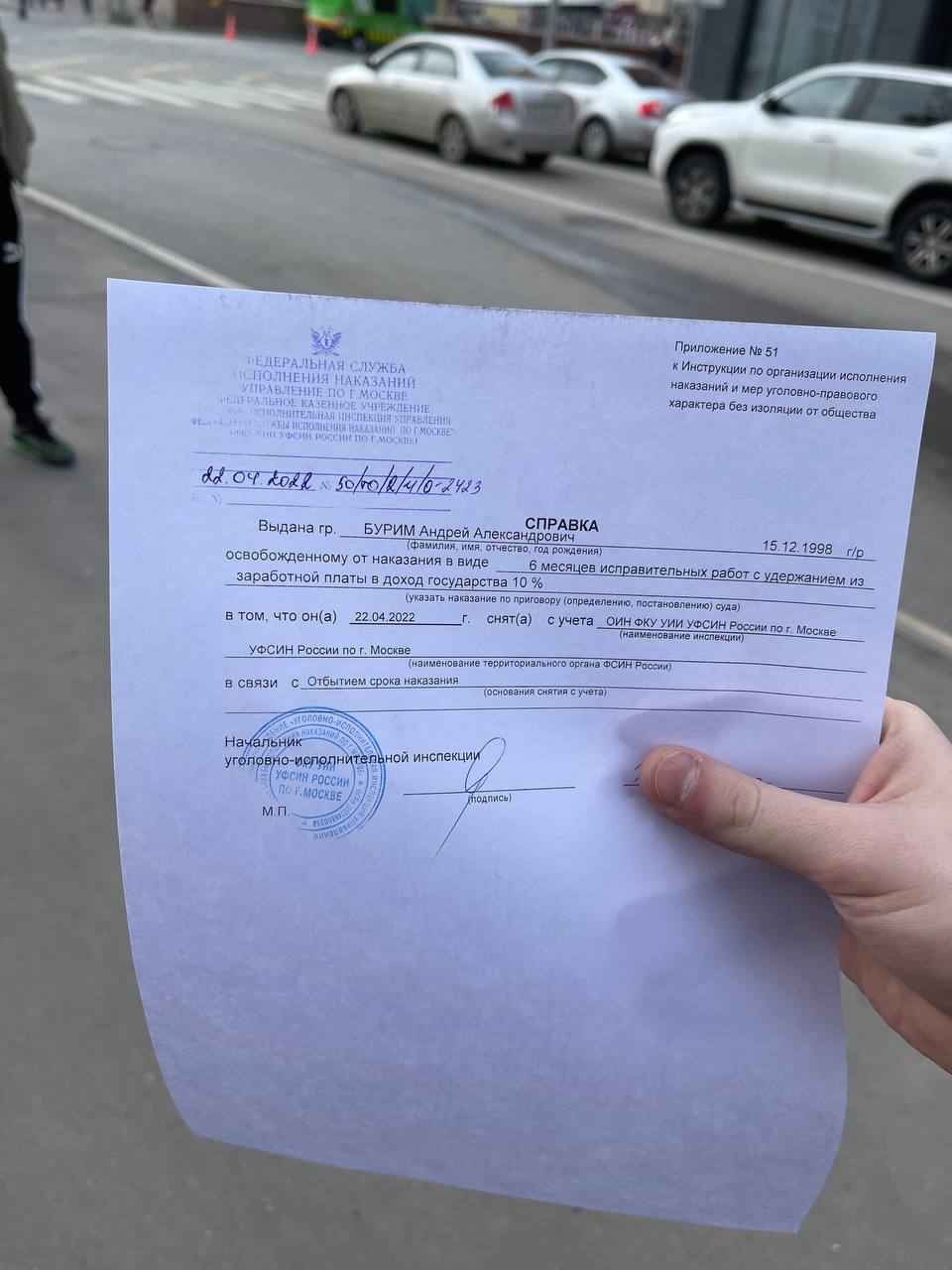 📎 Документ: справка от УФСИН о полном отбытии наказания Андреем Буримом (апрель 2022 года)
